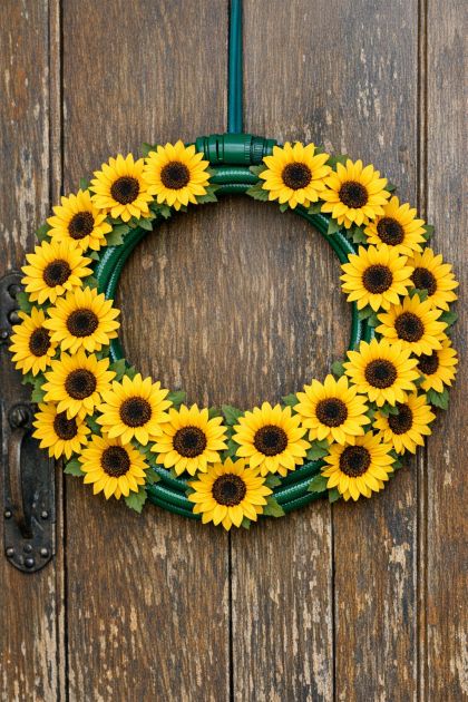 DIY Spring Door Wreath from Faux Sunflowers and Garden Hose