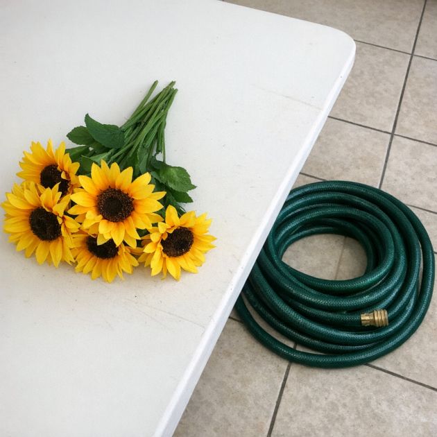 Use the hot glue gun to attach the sunflowers to the coiled hose, starting at one point and evenly spacing them around the circle.