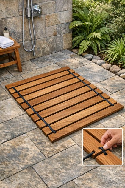 This DIY outdoor shower mat is a versatile addition to any backyard. The use of high-quality teak wood provides a natural and warm look, while the flexible rubber connectors add a modern twist. Place it by the poolside shower for an inviting and spa-like feel, or use it as a stepping mat leading to the pool. Its sleek design complements both contemporary and traditional outdoor settings, making it a stylish upgrade for any home.