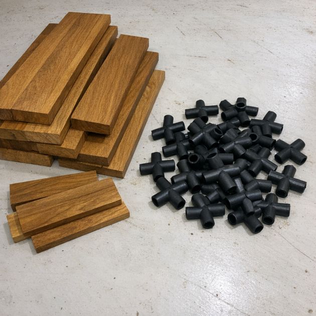 Using a drill, make holes at both ends of each board and at regular intervals along the board, ensuring they align with the holes in the rubber connectors.