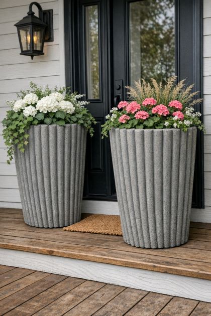 These planters work beautifully with minimalist and contemporary home designs. Pair them with sleek furniture and clean lines for a cohesive look. Use them to flank your porch steps or to create a symmetrical arrangement on either side of your entryway. The subtle texture of the cement and the vertical lines add an elegant touch, ideal for showcasing vibrant greenery or seasonal blooms.