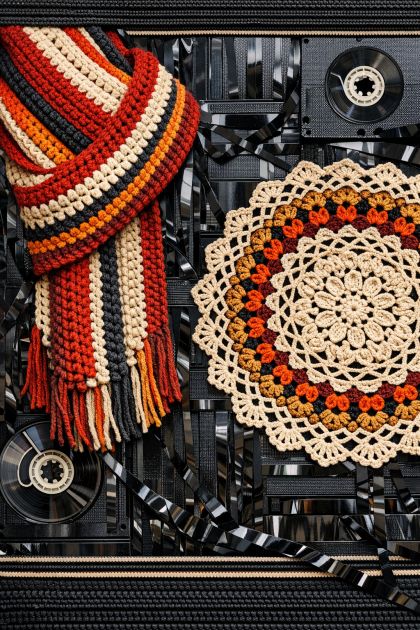 Position the VHS tape crochet piece between the two other crocheted items.