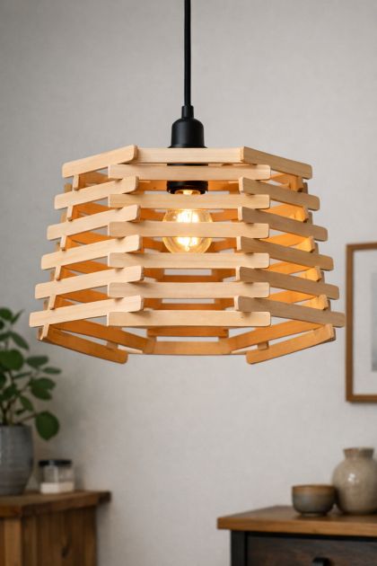 This DIY modern slatted lampshade pairs beautifully with contemporary or Scandinavian-inspired interiors. Its clean lines and natural wood finish complement neutral color palettes and can serve as a subtle statement piece in living rooms, bedrooms, or even home offices. To enhance its appeal, position the lampshade near other wooden or natural elements to create a cohesive and inviting atmosphere.