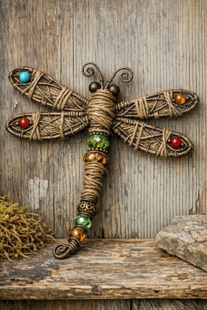 This DIY can be styled as a wall hanging or a centerpiece on a coffee table. Consider placing it in a minimalistic room to add a touch of rustic charm. The contrast between the raw, industrial look of the wire hanger and the softness of the other materials creates a balanced aesthetic that works well in modern, bohemian, or even farmhouse-style interiors.