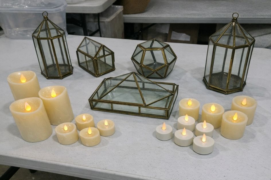2. Select LED pillar candles that fit comfortably inside each terrarium. Make sure the candles emit a warm white light for a cozy ambiance.