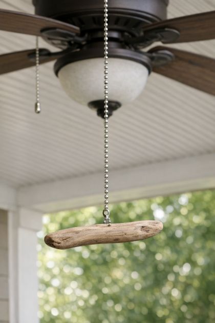 The finished DIY ceiling fan pull integrates beautifully into sunrooms or porches that blend indoor and outdoor elements. It complements farmhouse, coastal, or minimalist styles with its natural and understated elegance. The driftwood's organic texture pairs well with neutral color palettes and can serve as a subtle focal point that ties together other natural elements like wicker furniture or potted plants. Functionally, it provides an easier reach for adjusting the ceiling fan, adding both style and convenience to your space.
