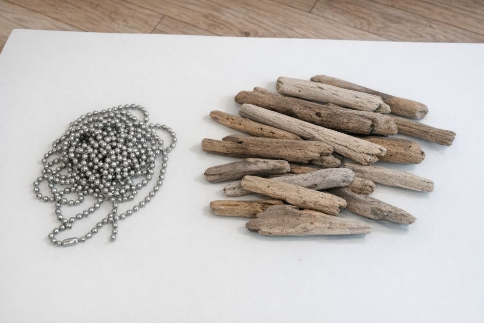5. Thread one end of the beaded chain through the eye hook attached to the driftwood.