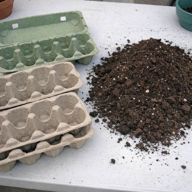 Cut each egg carton in half, separating the top from the bottom. Use only the bottom parts for planting.