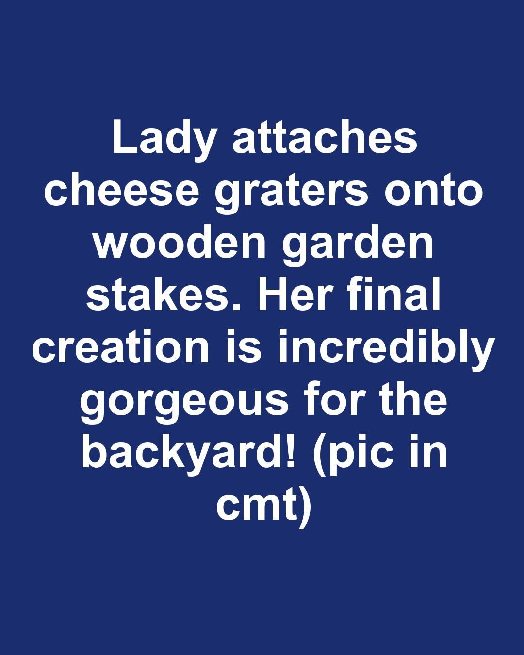 Lady attaches cheese graters onto wooden garden stakes. Her final creation is incredibly gorgeous for the backyard!