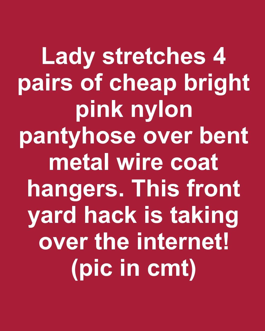 Lady stretches 4 pairs of cheap bright pink nylon pantyhose over bent metal wire coat hangers. This front yard hack is taking over the internet!