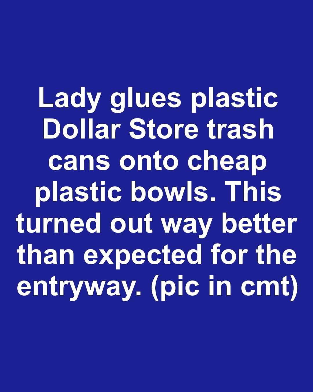 Lady glues plastic Dollar Store trash cans onto cheap plastic bowls. This turned out way better than expected for the entryway.